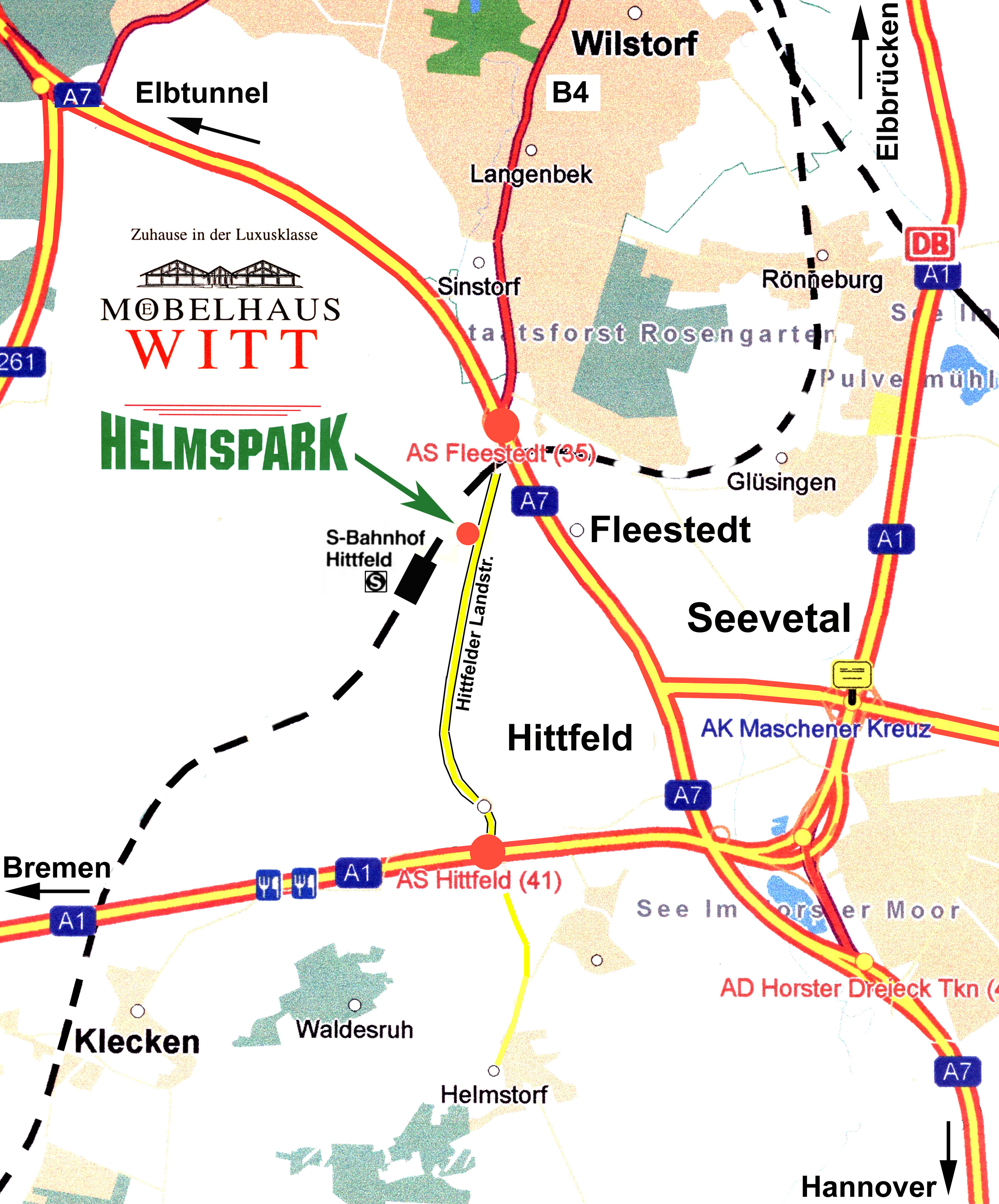 Der Standort zeichnet sich durch seine sehr verkehrsgünstige Lage aus. In unmittelbarer Nähe sowohl zur BAB A7 (Abfahrt Fleestedt), BAB A1 (Abfahrt Hittfeld) als auch A 39 Richtung Lüneburg. Der Bahnhof Hittfeld ist nur 3 Gehminuten entfernt.